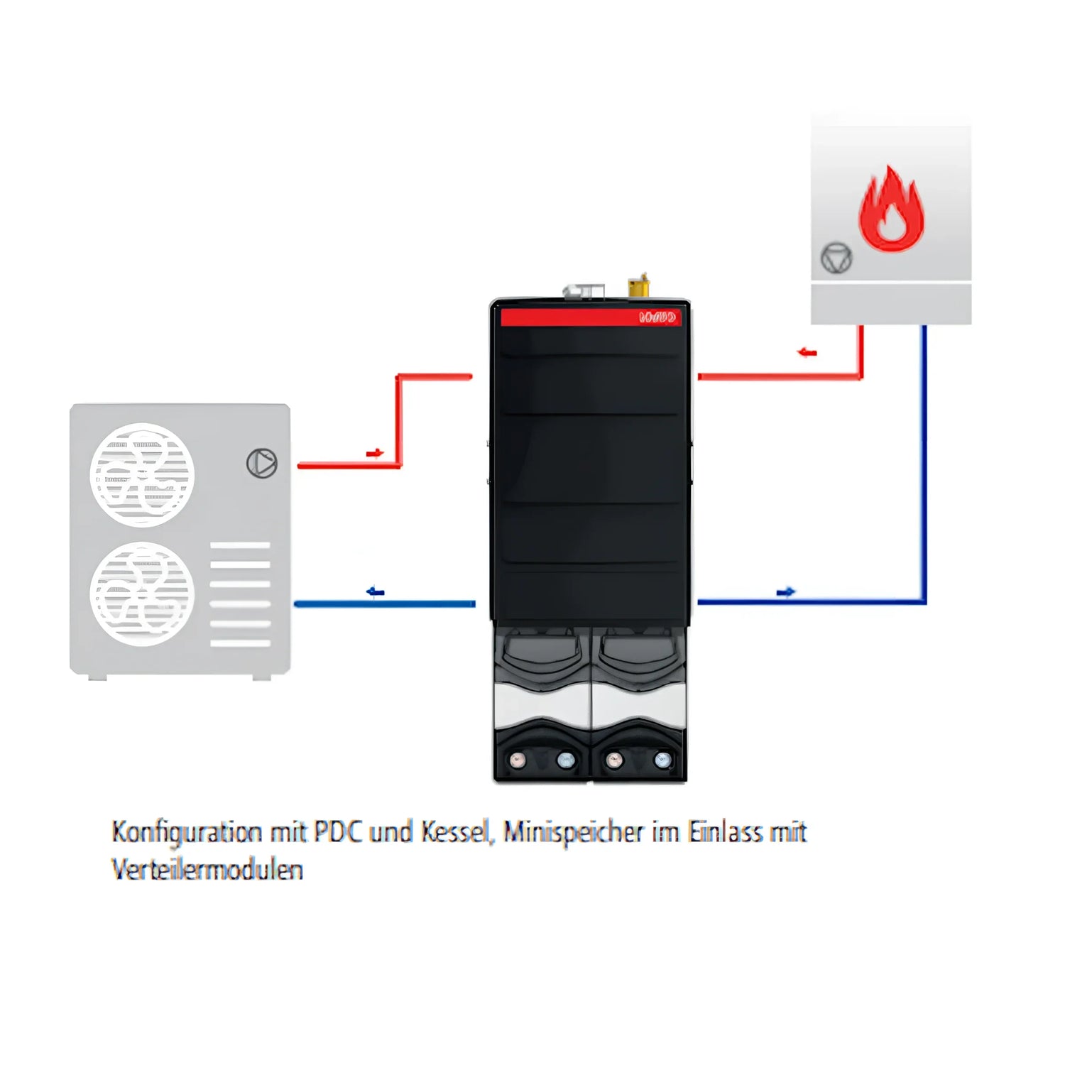 Оборудван с вътрешна мембрана и хидравличен сепаратор, резервоарът функционира и като разпределител за до два отоплителни или охладителни кръга. По този начин той не само осигурява ефикасно наслояване на флуида, но и надеждно координира разпределението на отоплителната или охлаждащата среда.