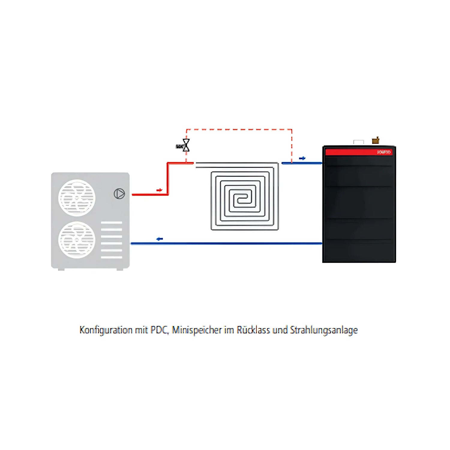 Буферният резервоар позволява свързването на до два енергийни източника, като например термопомпа и традиционен бойлер. Контурът, предназначен за термопомпата, осигурява оптимално използване на обема на съхранение с дебит до 4,5 м³/ч, увеличавайки времето за работа и енергийната ефективност на вашата система.