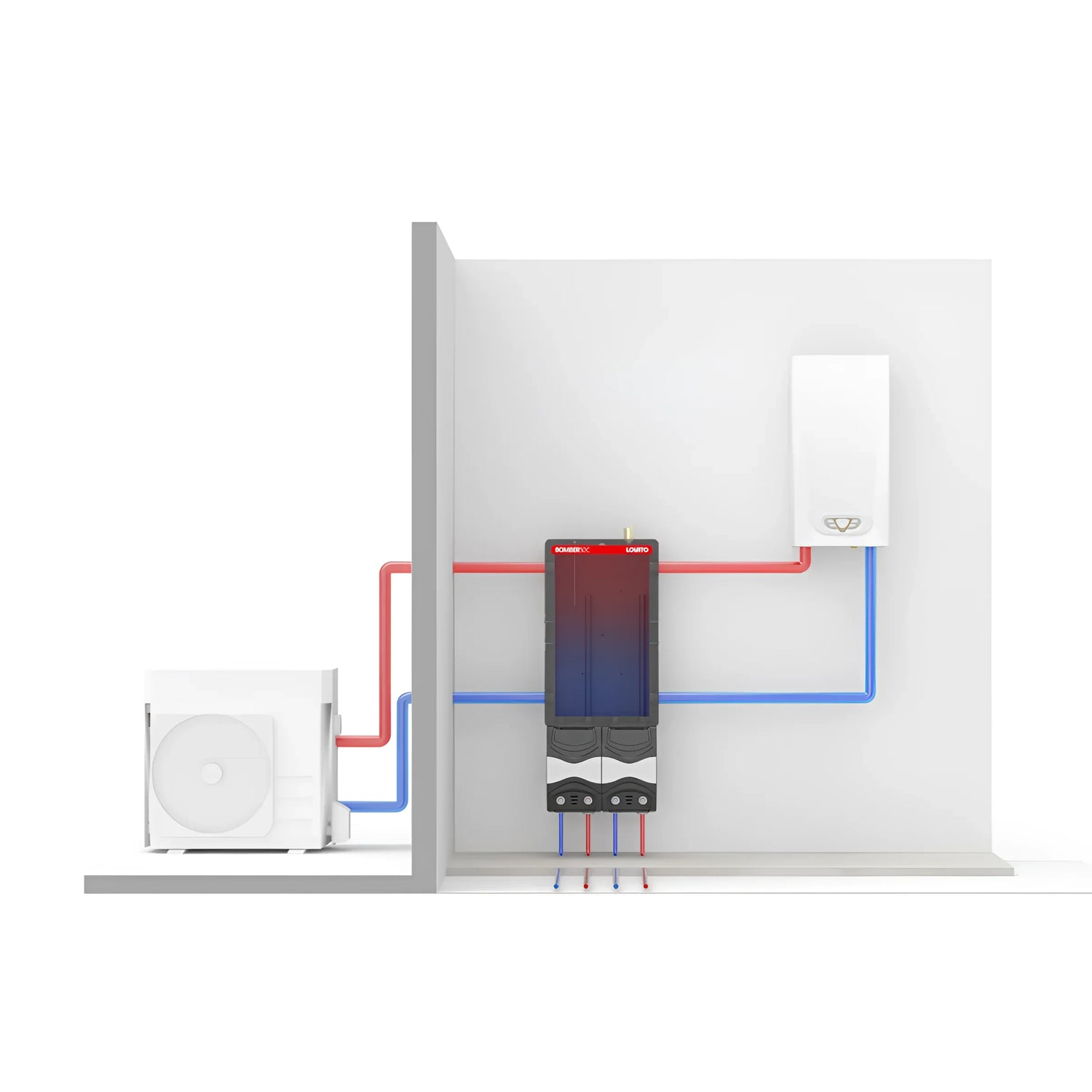 Lovato Bomber 50 C е ултратънък 50-литров мини буферен резервоар, специално проектиран за използване в компактни отоплителни и охладителни системи. С дълбочина от само 240 мм, той намалява предната повърхност с до 30% в сравнение със сравними решения и е идеален за стенен монтаж в жилищни помещения или сервизни помещения.