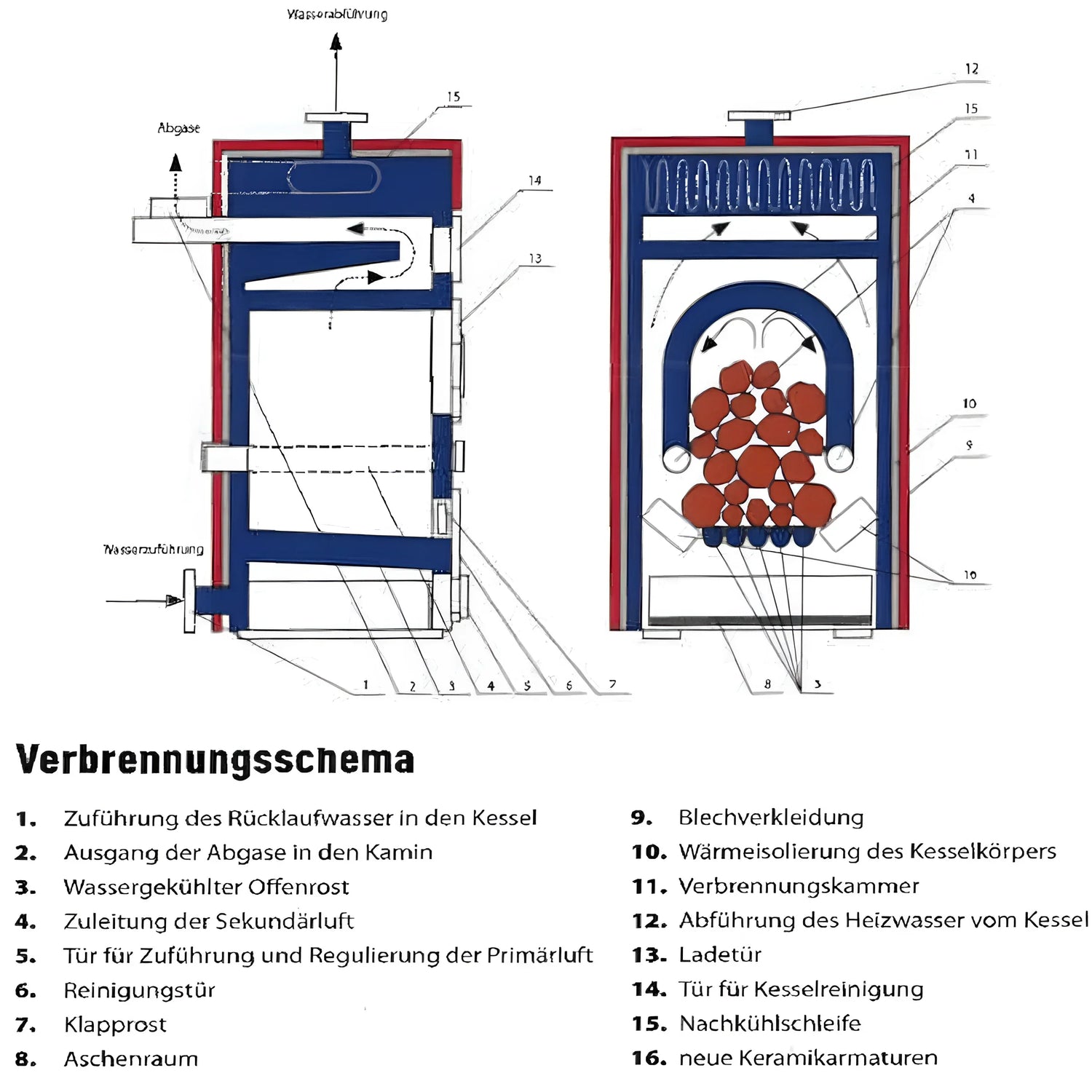 La energía se genera mediante un proceso de dos etapas: primero, los combustibles utilizados se gasifican en condiciones controladas. A continuación, se realiza una combustión convencional completa y limpia. La combinación de ambos procesos garantiza un uso especialmente eficiente del combustible. El suministro de aire primario y secundario se controla manualmente con facilidad, lo que favorece una combustión óptima y una larga duración de la combustión.