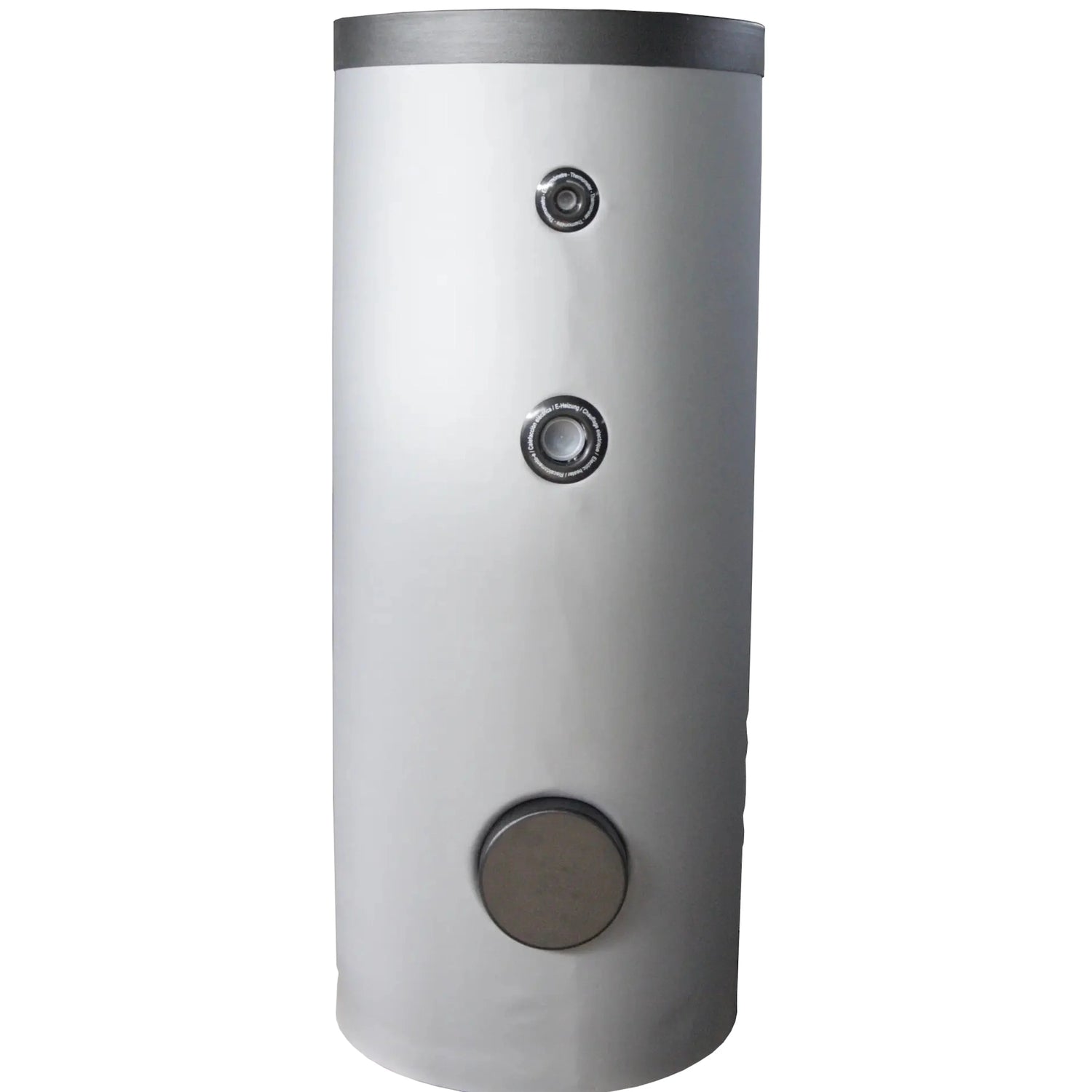 Stehender Brauchwasserspeicher, der zur Warmwasserbereitung verwendet wird. Der Speicher verfügt über zwei großflächige Wärmetauscher. Der obere Wärmetauscher kann in Verbindung mit einer Wärmepumpe genutzt werden, während der untere für eine Solaranlage oder einen Heizkessel geeignet ist. Um den Schutz vor Korrosion zu gewährleisten, ist die Kontaktfläche des Warmwasserspeichers mit einer hochwertigen Emaille-Beschichtung versehen und mit einer Magnesiumanode ausgestattet. Auf diese Weise erfüllt der Speicher die Anforderungen der DIN 4753 und stellt sicher, dass das Brauchwasser ausschließlich mit einer hygienisch einwandfreien Oberfläche in Kontakt kommt.