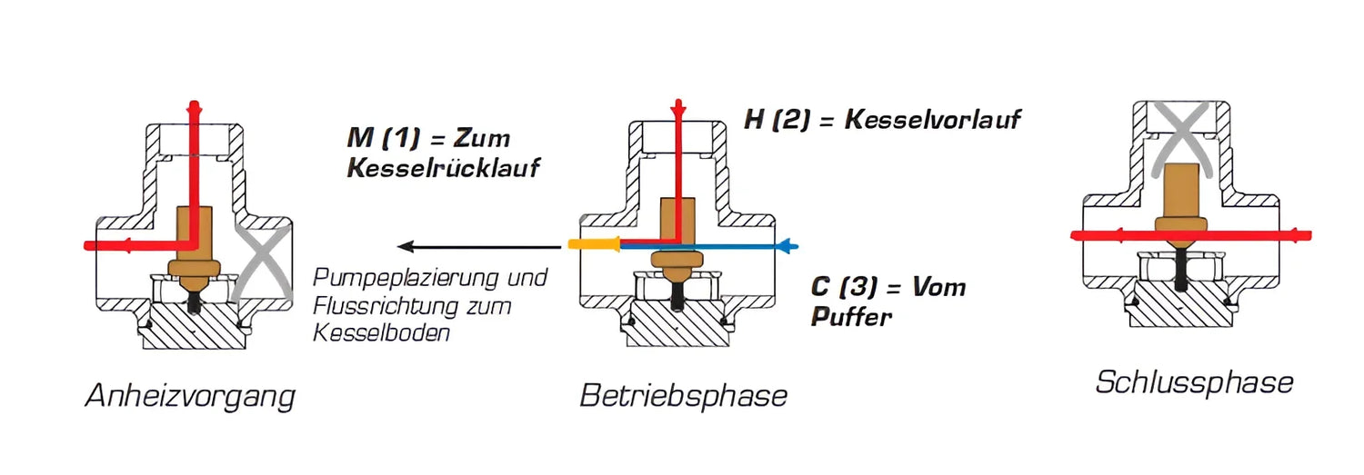The return flow booster of the Laddomat 11-30 is equipped with a thermal valve that continuously increases the flow from the buffer tank to the boiler as the flow temperature rises. This automatic throttling ensures that the boiler flow is completely closed at the end of the combustion process, thus efficiently charging the buffer tank. This intelligent functionality ensures the Laddomat 11-30 maximizes heat utilization and prevents unnecessary energy losses.