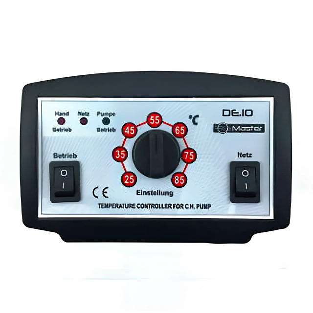 The Master DE.10 pump controller enables precise control of your circulation pump or boiler return flow booster. The temperature is easily adjusted using a convenient rotary dial. The controller switches the pump on as soon as the set temperature is reached and automatically deactivates it if the boiler temperature drops more than 2°C below the target value. This precise functionality ensures that the pump only operates when it is actually needed. This ensures energy-efficient operation and extends the pump's service life.
