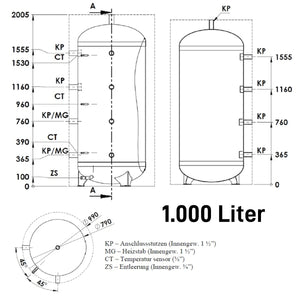 Connection dimensions: Connection piece (KP) internal thread 1½", heating element connection (MG) internal thread 1½", temperature sensor connection (CT) 3/8", Drain (ZS) internal thread 3/4".