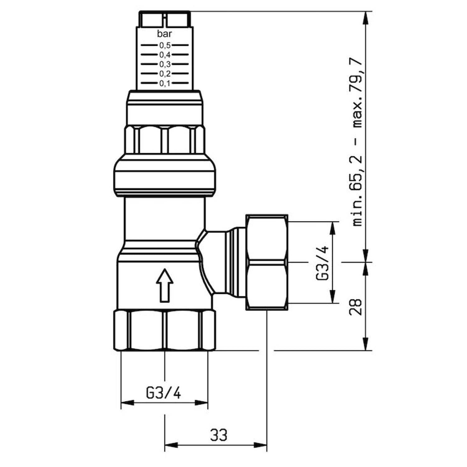 Töötemperatuuri vahemik: max 95 °C (lühiajalt kuni 120 °C). Töörõhk: max 6 bar. Diferentsiaalrõhk on pidevalt reguleeritav: 0,1/0,5 bar. Korpuse materjal: messing. Ühendused: Sisselaskeava G¾ sisekeermega, väljalaskeava lametihendiga kruviühendus G¾ ühendusmutriga.