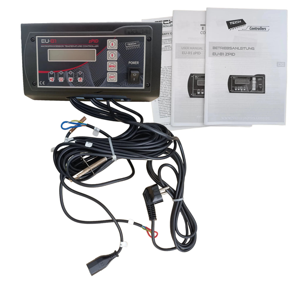 TECH EU-81 kontroller tarnitakse terviklahendusena ja sisaldab kõiki olulisi komponente koheseks kasutamiseks. Standardkomplekti kuuluvad temperatuuri regulaator, keskkütte ja sooja tarbevee temperatuuriandurid ning hõlpsasti mõistetav kasutusjuhend.
