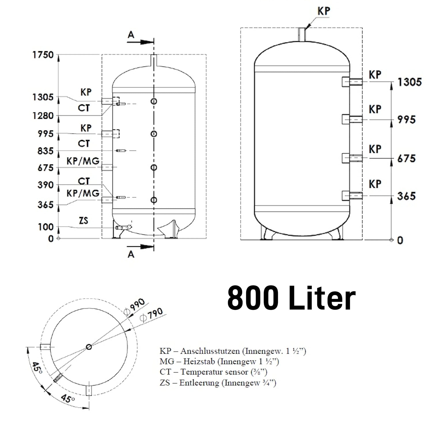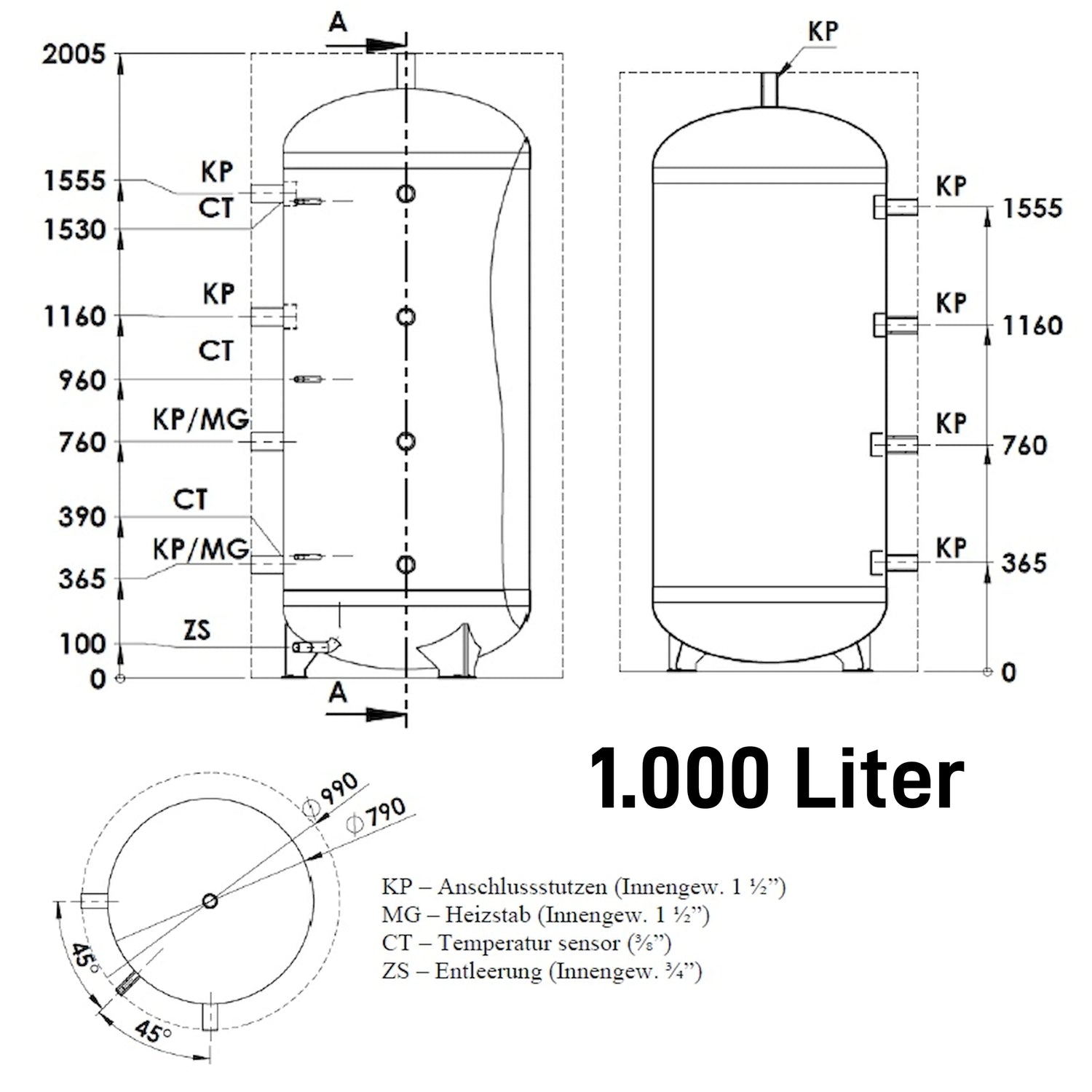 Dimensions de raccordement : Pièce de raccordement (KP) filetage intérieur 1½", raccord élément chauffant (MG) filetage intérieur 1½", raccord capteur de température (CT) 3/8", Drain (ZS) filetage intérieur 3/4".