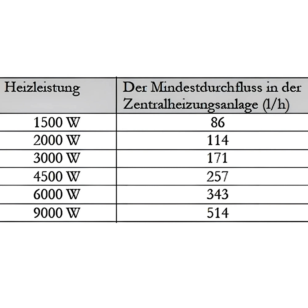 Die Minimaldurchfluss Werte variieren je nach Leistungsstufe: Ab 86 l/h für 1,5 kW, 114 l/h für 2,0 kW und 171 l/h für 3,0 kW. Dadurch wird sichergestellt, dass das Heizsystem auch bei variierendem Wärmebedarf effizient arbeitet.