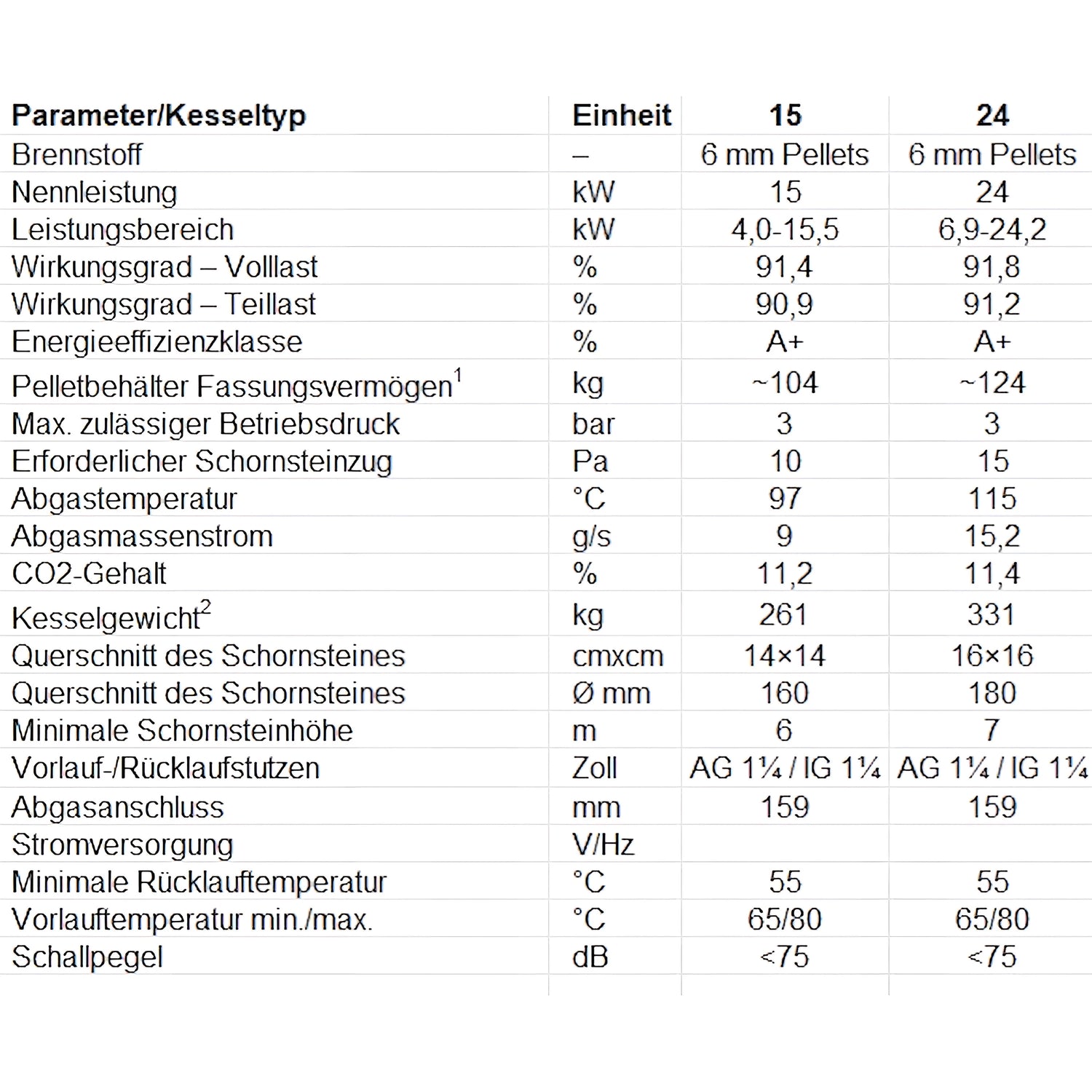 Razpoložljive nazivne moči vključujejo 15 kW in 24 kW; Na splošno serija pokriva širok razpon moči od pribl. 11 do 30 kW. Naprava ustreza emisijskemu razredu 5 ter zahtevam standarda Ecodesign in se uvršča v razred energijske učinkovitosti A+.